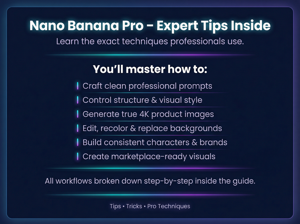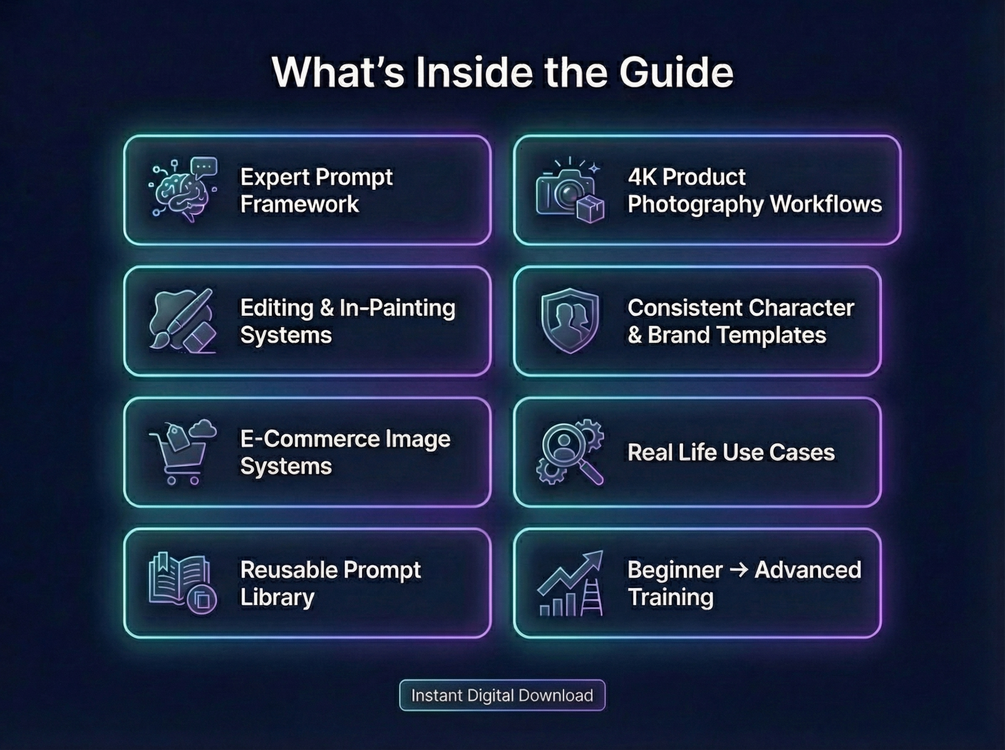 The Ultimate Nano Banana Pro Guide is a complete, step-by-step system designed to help you master Nano Banana Pro prompts, product photography, 4K image generation, editing workflows, and professional visual creation — all in one place.