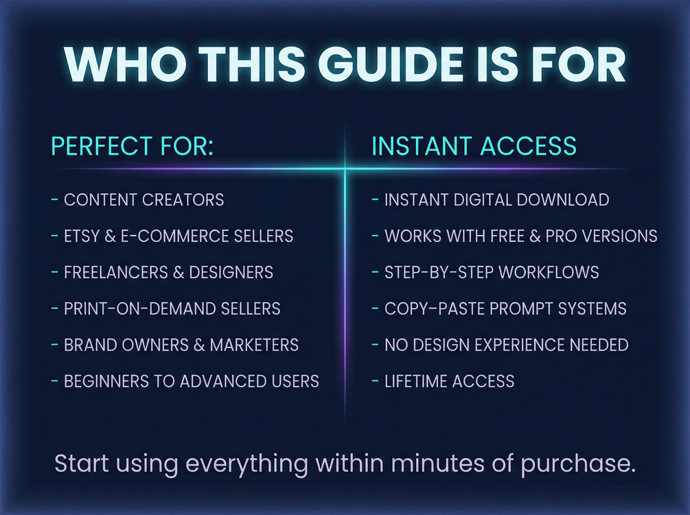 This guide is updated regularly with new workflows and prompts. You’ll always have the latest prompt techniques, product examples, and best practices — no extra cost.